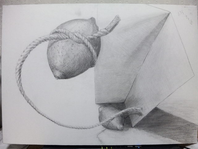 A4厚紙、紐、レモンを用いて、空間的に構成デッサンしなさい。