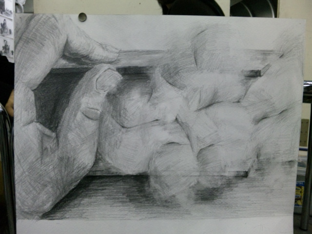 配布されたモチーフ(なんか木の板みたいなやつ2枚と綿)と手の関係を観察しデッサンしなさい。
