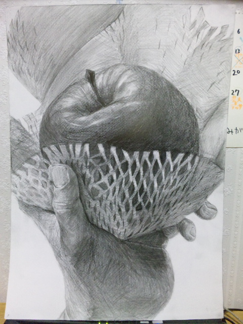 与えられたハニカムシート1枚と、持参した赤りんご1個と手の関係を観察し、デッサンしなさい。